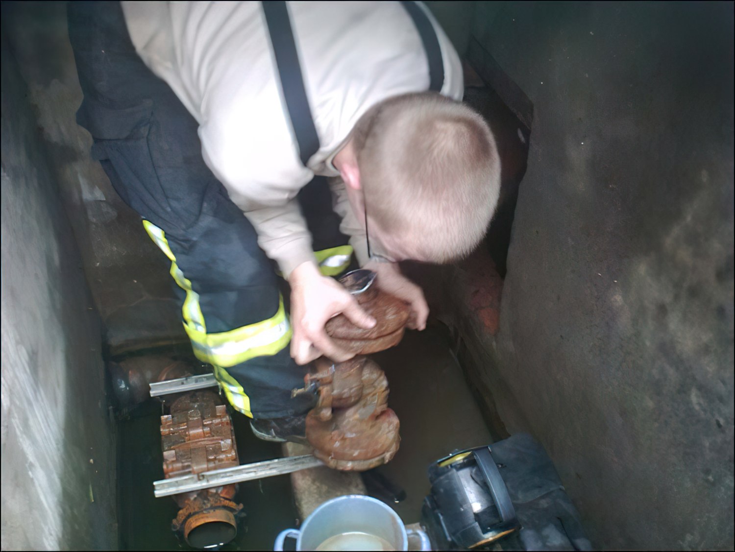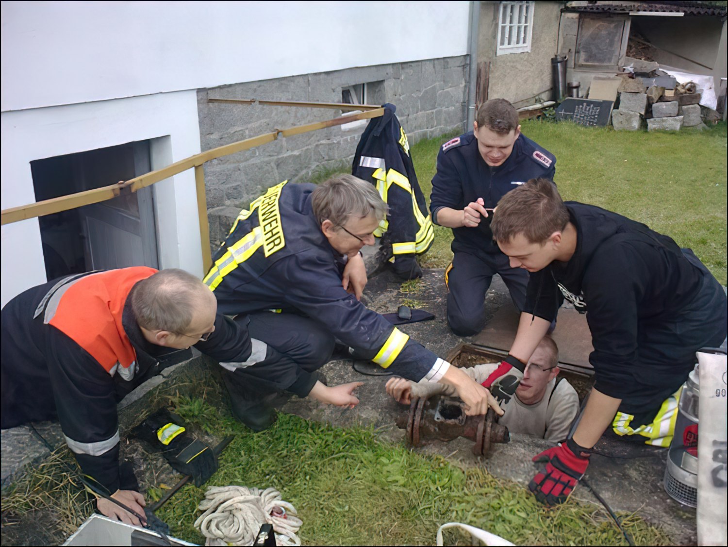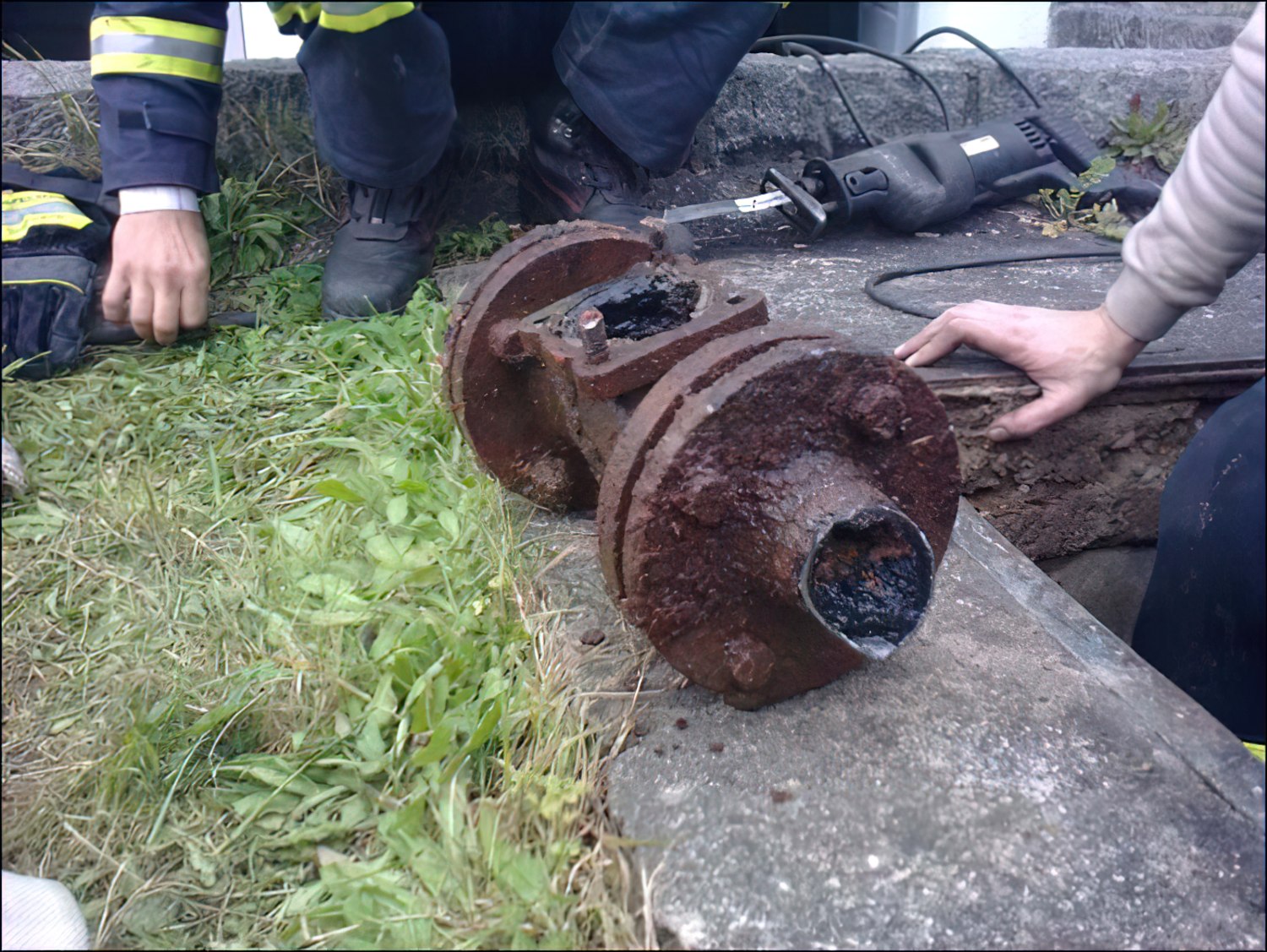 Am 02.10. rückten wir wieder auf den Uferweg aus, da der Keller schon wieder unter Wasser stand, obwohl der Wasserstand der „Pulsnitz“ zurückgegangen war und das Wasser eigentlich ungehindert ablaufen könnte. Wir pumpten den Keller erneut aus und stellten fest, das ein Schieber im Ablauf zugerostet war. Da dieser keine Funktion mehr hatte, eine Rückschlagklappe wurde nachträglich eingebaut, sägten wir ihn mit der Säbelsäge vom Rohr ab. Nun kann das Grundwasser wieder selbstständig ablaufen und wir konnten wieder einrücken.